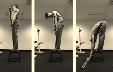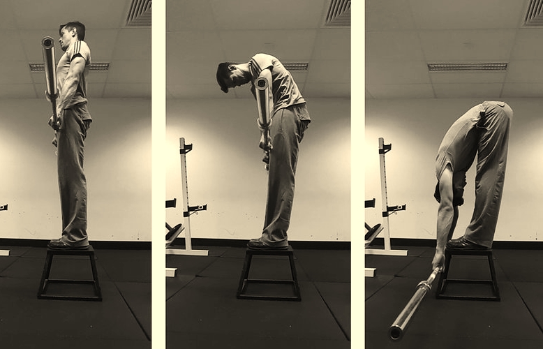 Ga op een box staan met een kettlebell of stang in je handen. Je staat rechtop, benen tegen elkaar en tenen aan de rand van de box. Breng je kin naar je borst en rol dan heel langzaam, wervel voor wervel af naar beneden.